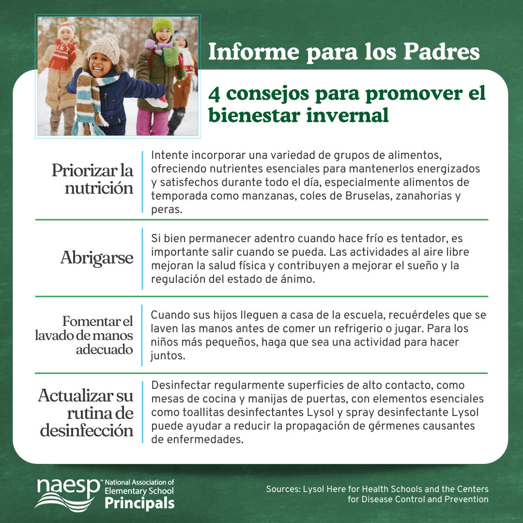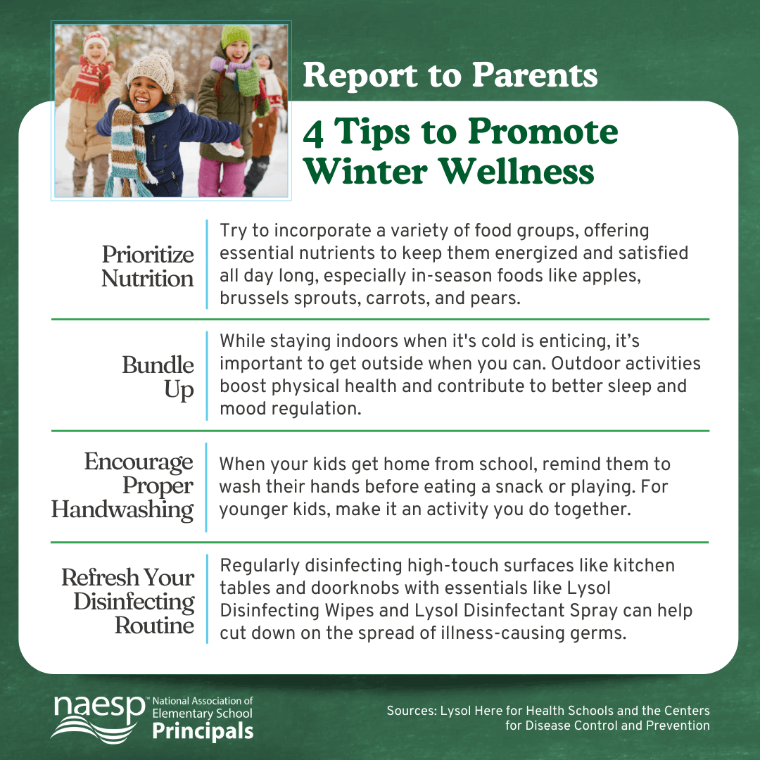 During the winter season, it becomes easier for kids to come into contact with germs that cause illnesses like cold and flu. Encouraging healthy habit practices at home is a proactive measure to help ensure kids maintain their health and contribute to the overall well-being of their school communities. This edition of Report to Parents four strategies to promote winter wellness. Share it with your school families.