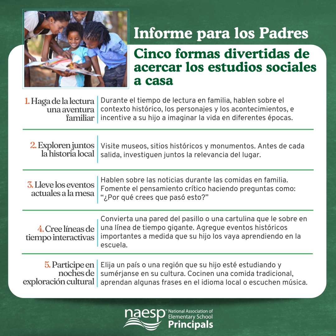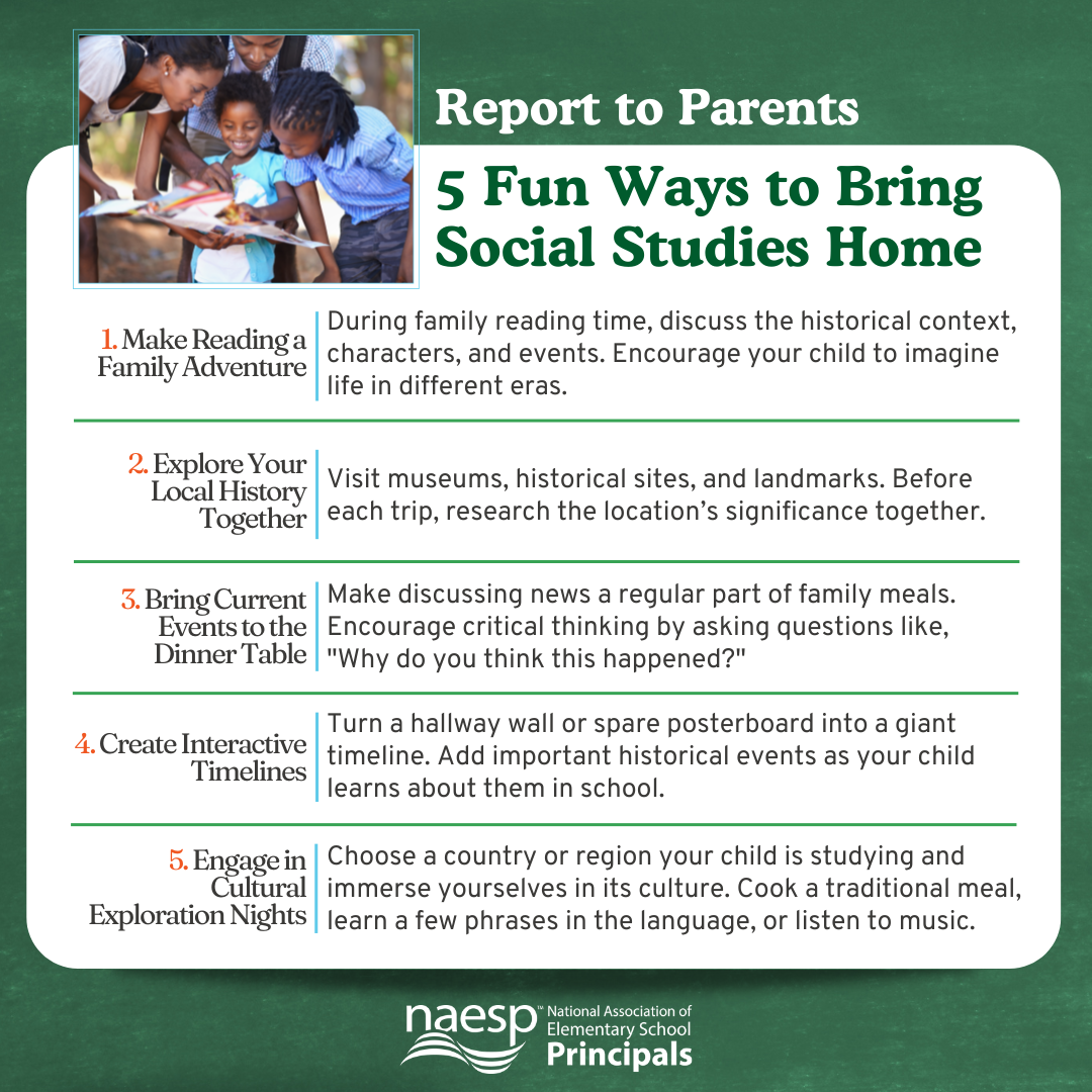 Families play a crucial role in reinforcing social studies concepts learned in the classroom. In this edition of Report to Parents, find five engaging ways families can help their child explore history, geography, and civics at home.