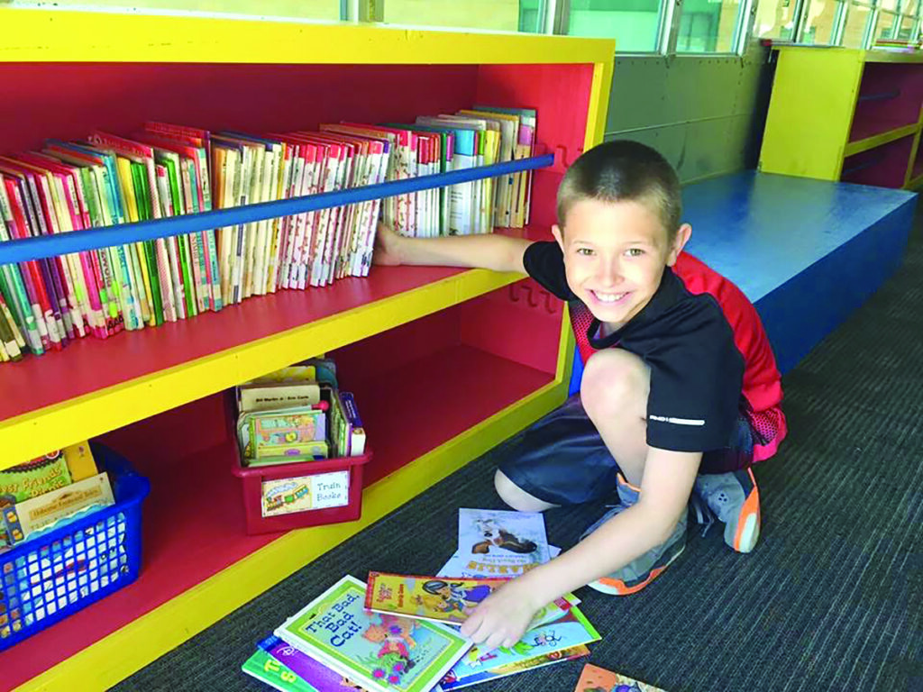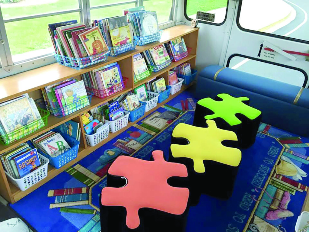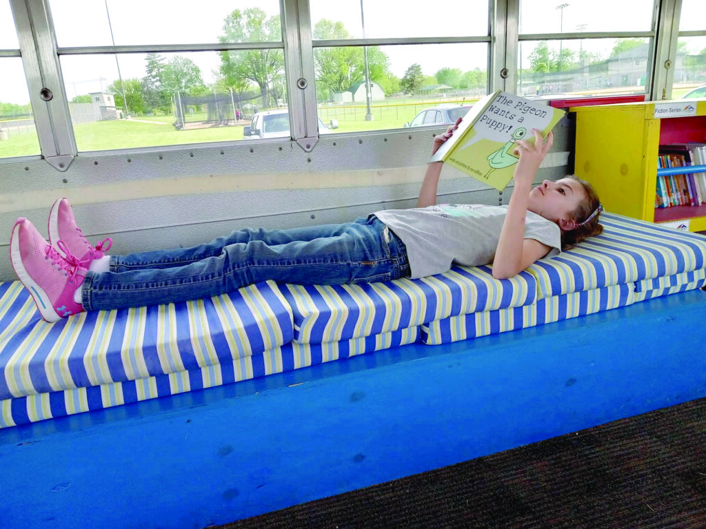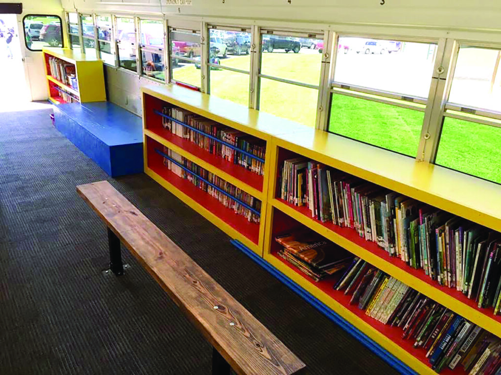 A member of the local Rotary Club, Thomann got the organization to help fund the initiative. The district donated an old bus; high school vo-tech students replaced the seats with bookshelves and benches and painted its exterior sky blue. “I love that connection,” Edwards says. “It was the kids who used to be here helping the kids who are currently here.”