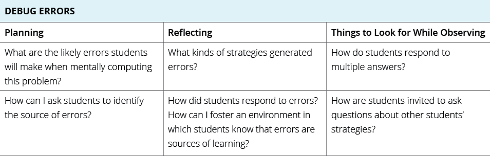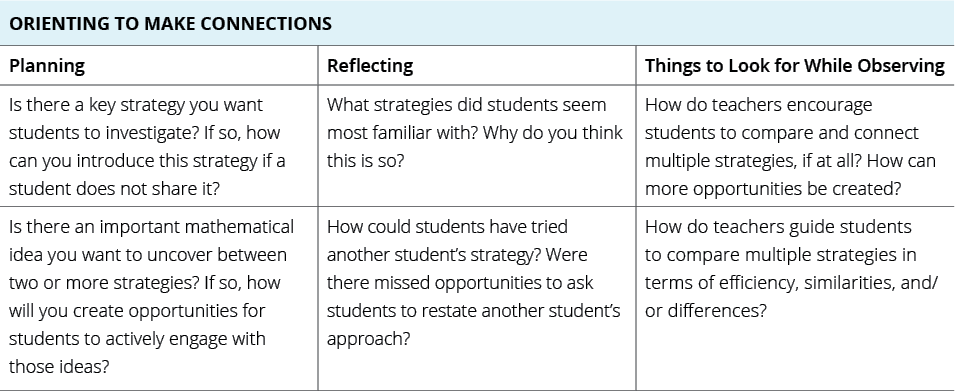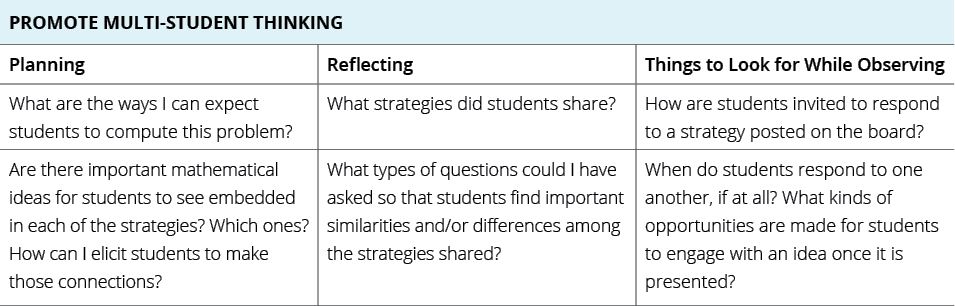 We offer the following guides to help principals and teacher leaders work with teachers to make Number Talks more powerful. Each of the tables below is meant to foster conversations in which principals and/or teacher leaders support teachers to use one of the three teacher moves identified in Table 1 to enhance enactment of Number Talks. Each table provides questions that can be useful to planning, reflecting, and/or observing a Number Talk.
