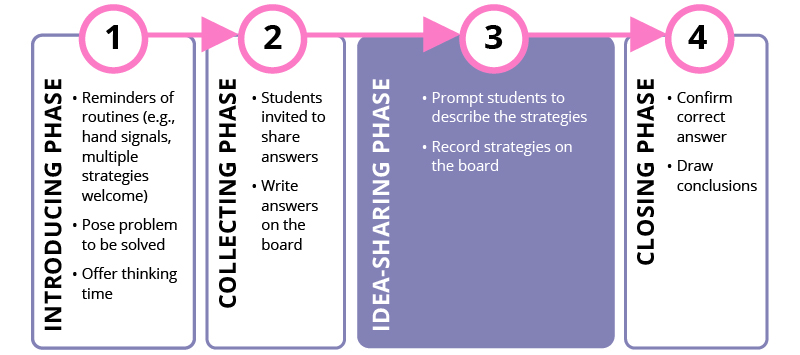 The routine includes four phases: Introducing, Collecting, Idea-Sharing, and Closing (Figure 1). Within this structure, we noticed the most variation in the Idea-Sharing phase, where students take ownership of their ideas while making and seeing connections among various strategies as observed in a classroom.