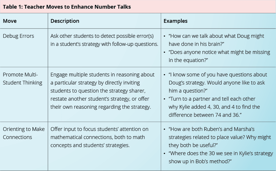 Number Talks have a clear structure and simple routines that are easy to incorporate into classroom practice, but Number Talks aren’t enough to shift a school to ambitious instruction. In our work with pre-service and beginning teachers, we found that teachers implemented Number Talks in a predictable way that aligns with how they are described in math texts.
